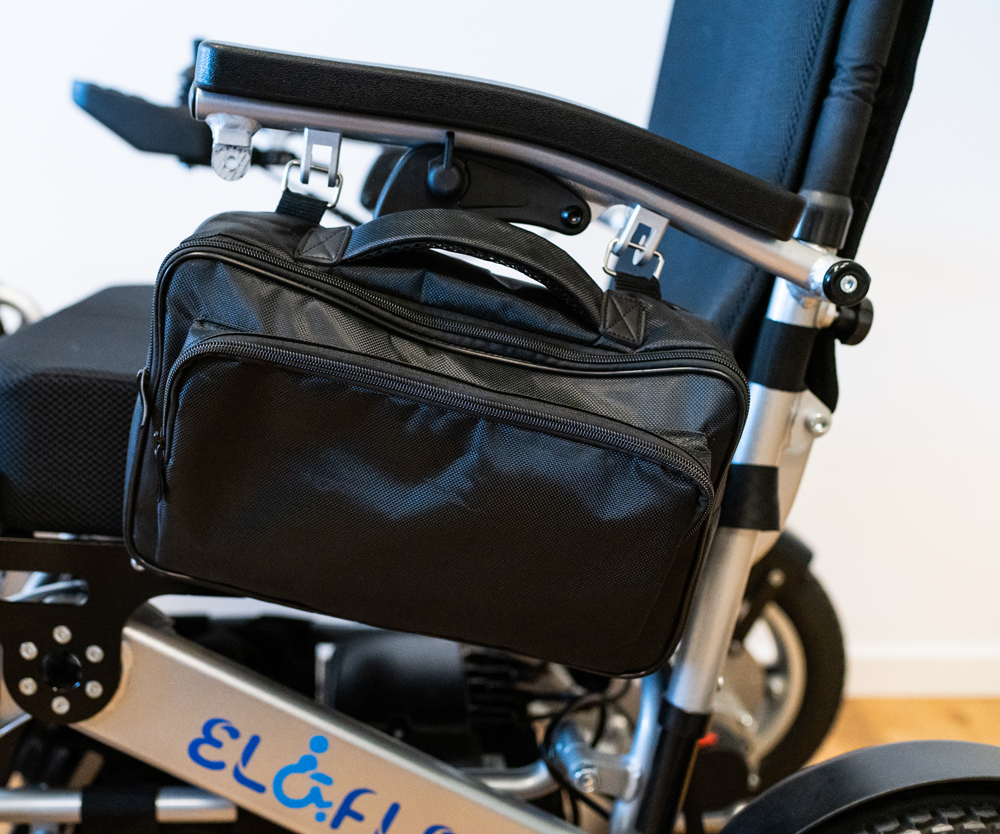 Torba boczna Eloflex pozwala wygodnie przechowywać takie przedmioty jak portfel, telefon i inne cenne rzeczy, zapewniając do nich łatwy dostęp. Torba jest mocowana za pomocą haczyków przykręcanych pod podłokietnikiem. Aby uzyskać dostęp do swoich rzeczy, wystarczy odczepić torbę od wewnętrznej strony podłokietnika, nie martwiąc się o kradzież.
